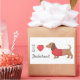 Adorable cartoon wiener dog in a red plaid sweater. Also includes “I Heart Dachshund” lettering. The word “Dachshund” can be replaced with your dog’s name.