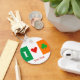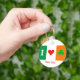 The Irish tricolor flag with a red heart in the centre white panel of the flag, a green shamrock on the orange panel of the flag on the right, and the letter I in white against the background of the green panel of the flag on the left. Reading from left to right the symbols express " I love / heart Shamrocks " The text at bottom is customisable and may be personalised and moved anywhere on the keyring