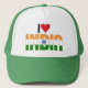 I love India Inscription Flag Saffron Green Trucker Hat with the inscription "India" which is infused with the pattern from the Indian national flag. Ashoka Chakra is integrated and infused in the inscription. Design is finished with the black letter "I" and the red heart which represents love. India Trucker Hat is the perfect gift for the Indians proud of their heritage.
