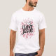 This captivating graphic art features a stylised heart wrapped in a delicate ribbon that reads “I Love Jesus.” The heart is adorned with blooming flowers and lush greenery, symbolising devotion, faith, and the blossoming of love for Christ. The vibrant colours evoke warmth and positivity, making it an inspiring design for believers. Wear this t-shirt proudly to express your faith and share the message of love