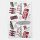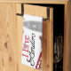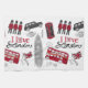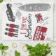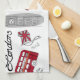 A fun London souvenir featuring palace guards, Big Ben, red phone booths, and the iconic double decker bus on a useful kitchen towel. Red, white, black, and grey.