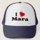 I love Mara! Is your name Mara? Do you have a husband, boyfriend, male family member or male friend who you know loves you? Or do you have a wife, girlfriend, female family member or female friend named Mara whom you love deeply? If so, this "I Love" hat is exactly the gift that you're looking for! The design features the letter "I" in black lettering with a red heart on the top and "Mara" in black lettering on the bottom.