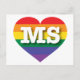 This postcard features a heart with a rainbow pride design and the letters MS. Atop the stripes, within the heart are the bold, white, capital letters MS, the official abbreviation for Mississippi, the magnolia state. Show your true colours, support marriage equality, and celebrate gay pride. The reverse side of the postcard is blank, awaiting your customised text or handwritten sentiments.