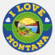 I Love Montana State Flag and Map. Taking its inspiration from the state flag, this design features a blue, two-tone green and yellow colour scheme, plus white hearts. This frames the central motif from the state flag, superimposed on the state map. With cool distressed typography featuring the phrase 'I LOVE MONTANA'.