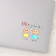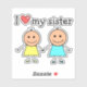 Cute stick figures, one wearing a yellow dress and the other a blue dress, holding hands with big happy smiles. Above the girls in black lettering are the words I Love My Sister. The word love has been replaced by a pretty red love heart with a frilly edge.