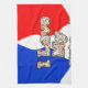 The backdrop is divided vertically, featuring a deep blue on the left and a bold red on the right.