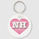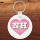 This key chain features a calm, cool, and collected pink heart with a white-washed center containing the bold, white, upper case letters NH, the official abbreviation for New Hampshire, the granite state.