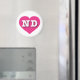 This product features a vibrant hot pink heart containing the bold, white, upper case letters ND, the official abbreviation for the state of North Dakota.