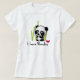 T-shirt reads I Love Pandas with a cute red heart, and displays a cute and adorable illustration of a panda bear sitting amongst his bamboo stalks in a little grove looking happy and loveable.