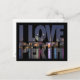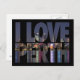 Postcard featuring 'I Love Perth' text with a cut out photo of the Perth city skyline and reflections over the Swan River.