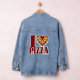 A fun I heart pizza slice of love yummy cheesy pepperoni fun logo Italian food statement design denim jean jacket. Get an epic denim jean jacket today.