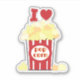 "I Love Popcorn" sticker features a tub of buttered popcorn. Perfect for the popcorn lover in your life.