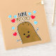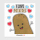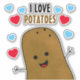 Fun happy brown potato surrounded by red and blue love hearts with I Love Potatoes in black and brown lettering above his head.