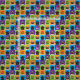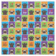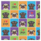 I Love Pugs Colour Squares Large Pattern has fawn and black pugs alternating with I Love Pugs in blue, green, orange and purple squares.