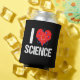 A cool science teacher can cooler in black that features an awesome I Love Science pattern with a red heart wrapped with an atom model.
