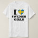 a white T-shirt with the playful and affectionate phrase "I Love Swedish Girls" emblazoned on the front. The word "Love" is represented by a heart-shaped Swedish flag, which adds a touch of national pride and affection for Swedish culture. The T-shirt is designed in a classic style with a round neck and short sleeves, suggesting a casual and comfortable fit. It's a piece that could appeal to someone with a fondness for Sweden or as a lighthearted souvenir representing personal connections or memories related to the country