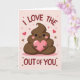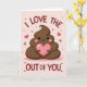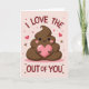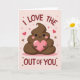 Around the main character are smaller hearts and asterisks in different shades of pink and red, creating a loving and festive atmosphere. The text, in a bold maroon font, forms a circle around the character, saying "I LOVE THE OUT OF YOU" in a clever way. This mix of words and image turns a simple message into a funny and sweet declaration of love. The overall look is clean, bright, and uses a simple color scheme that feels fresh and modern, perfect for sharing some heartfelt Valentine's Day sentiments. ❤️💌🍫