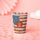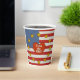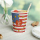 These Sturdy Hot/Cold Paper Party Cups feature Leslie Sigal Javorek's delightfully original patriotic design based on the American Flag: w/ alternating polka-dotted stripes of red and white; a polka-dotted blue block in the left-top corner; topped w/ a wreath of spicy mustard colour stars surrounding a shaggy red heart proclaiming "I Love the USA!" Option to add a lid!
