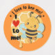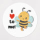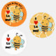 I love to bee me! round sticker. A Cute bumblebee together with text forming «I love to bee me!». Honeycomb in the background with dripping honey. The honeydrop and the bumblebee have a shadow to Create a 3D effect on top of the background. This positive, motivational and happy sticker are useable in many situations; this Size and style are perfect on displays and packaging. Maybe a product with honey. 3 different design, sheet of 15 in total, one design with Customisable text.