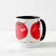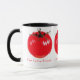 This Mug features an original design with three bright red tomatoes in a row at the top, and the sentence "I love tomato soup!" under the photos, in three languages: French, English and Spanish. The tomato in the photo looks "electrified", with the green stem and leaves made of zigzag lines, and a zigzag line white highlight on the shiny tomato red skin. These tomatoes are red hot, and this mug is great for tomato soup.