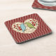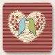 This coaster features HoMeArts' original design of Robin's egg blue and avocado green lovebirds surrounded by branches & red holly berries in a lemon yellow heart stand out from a background of dark red and cream coloured stripes.