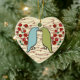 This whimsical heart shaped ceramic ornament is adorned with HoMeArt's original digital painting featuring 2 robin's egg blue & avocado green birds lovingly looking at each other from their perch on wiry thin branches covered w/ sprigs of juicy cranberry red berries on a lemon yellow background. 5 custom text fields on the back help make this a treasured gift.