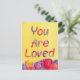 A colourful encouragement postcard featuring "You Are Loved" and a row of tulip flowers in bright shades of red, purple, and yellow orange on a yellow watercolor wash background.