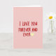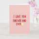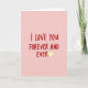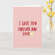 This card features a clear declaration of love that reads, "I LOVE YOU FOREVER AND EVER," in big, bold letters at the center. The text is a deep, cherry red color with a hand-drawn look, giving it a personal touch like a handwritten letter. Against a soft, blush pink background, the red text stands out, creating a gentle, romantic atmosphere.