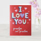 This greeting card centers on the big message “I LOVE YOU” across the middle in large white letters with dark shadowing that makes them stand out. The background is a deep red, sprinkled with many small pink hearts scattered all over. In the word “LOVE,” the first “O” looks creamy and holds a red heart inside it, and the “V” is shaped like a lavender heart filled with tiny white hearts. The second “O” has a soft pink center with a heart detail that matches the sweet theme. Under the main words, “grandpa and grandma” appears in smaller white cursive-style lettering near the bottom. The whole design feels warm and affectionate, like a simple way to say “you matter to me” without needing a long note. It’s especially meaningful for family because it’s direct, loving, and easy to read at a glance 🥰❤️. Hope it helps you share Valentine’s Day sentiments with someone you love.