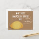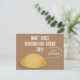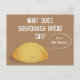 A postcard that features a bread joke. The design asks “What does sourdough bread say?” And then the illustrated bread loaf below says “I’m a self-starter!” The postcard’s colour scheme is brown and white.