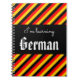 This notebook design features a pattern of black, red and yellow stripes, inspired by the colours of the German national flag. It also features the message, "I’m learning German". It could be used to record notes, vocabulary, phrases, and other info useful when learning the German language.