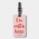 I’m outta here. Customisable luggage tag with a funny minimalistic red on pink text based design.