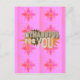 The I Am Thankful For You Floral image features a charming postcard design with a soft pink background adorned by a repeating floral pattern. The phrase "I'M THANKFUL FOR YOU" is centrally placed in a stylised, slightly distressed font, creating a warm and inviting feel. The floral pattern is arranged in a grid-like manner, with each flower showcasing a symmetrical, star-like shape. The overall composition is balanced and visually appealing, allowing the central message to stand out against the patterned background.