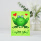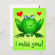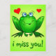 A cute green cartoon frog with red hearts, big googly blue eyes, for friends and loved ones - "i miss you!". You can change the text to any brief message you like, such as - thank you, i love you, call me, be hoppy!