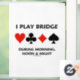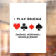 Showcase your wry bridge / duplicate bridge sense of humour with this window cling featuring the four card suits along with the following saying for avid bridge tournament attendees: "I Play Bridge During Morning, Noon & Night". Make others do a double-take at your mental stamina for the game of bridge with this bridge saying window cling today! Memorable bridge saying window cling for any bridge club.