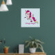 A poster with a funny saying: I poop magic. Designed with a white winged unicorn with pink mane, tail and hooves. The horn has rings of rainbow colour and looks like a candy lollipop. This cute unicorn is rearing up on its back legs. Sweet pink heart on its cheek and long girly eyelashes. A rainbow beside the word magic.