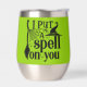 This classic Halloween design features the spooky phrase "I Put a Spell on You" in a bold, gothic-inspired font. The black and white colour scheme enhances the eerie atmosphere, making the design perfect for the Halloween season. Accompanying the text are iconic witchy elements, including a pointed witch's hat, a broomstick, a spider web, and a tiny spider, all arranged to create a bewitching composition. The subtle detailing of dots around the text adds a touch of magical charm.