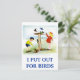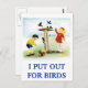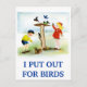 A whimsical image of children feeding birds, and even enjoying the company of a hungry squirrel. Caption reads I PUT OUT FOR BIRDS. A cute card for bird lovers that put out.