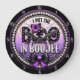 This quirky circular illustration features a stylised black spider with large, expressive eyes and a glittery purple flower. The spider is surrounded by pearls, a black bow, and a spiderweb. The text "I Put the Boo in Boujee" is written in a bold, spooky font, giving the art a fun, Halloween-themed, and luxurious feel.
