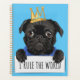 This dog themed design features a pug wear a crown with a sign which says i rule the world.