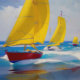 "I saw three boats" Seascape . A colourful and restful seascape in the style of a watercolour. With sailing boats in a choppy sea. Colours of vibrant blue and yellow.