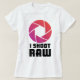 I Shoot Raw T-Shirt. © Tees & Sweats at Zazzle. This tee has a large pink aperture symbol and the words "I shoot raw" on it.