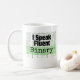 This design features a digital design with the text "I Speak Fluent Binary" in bold black font. The background is a grid of green "1"s and "0"s, resembling binary code. The design implies fluency in coding or computer language, with the words "fluent binary" suggesting proficiency in understanding and working with binary code. The image is a playful and creative way to represent someone's skills in computer science or programming.