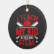 Humourous baseball ceramic ornament with red and white text reads I Teach My Kid to Hit and Steal.