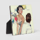 Artist:Joe DeMers | Woman in a zebra striped dress and red flower pin leaning over in a chair talking to a man in a white suit