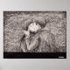 Romantic painting of lovers kissing in the snow. Watercolours black and white