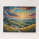 A figure stands on a path in the hills, as the sun sets over a peaceful valley on this beautiful jigsaw puzzle. Peaceful and contemplative, with plenty of detail and colour.
