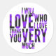 The perfect purple and black design stating loud and clear: I WILL LOVE WHO I LOVE THANK YOU VERY MUCH. Stick 'em everywhere and share!