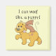 A happy looking brown dog with black kid style text that reads "I can woof like a puppy!" on puppy dog T-shirts, tote bags, stickers, mugs, and more.