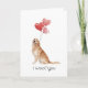 This Customizable valentines day card features a watercolor style portrait of a golden retriever holding a bouquet of heart shaped balloons with the caption "I Woof You".